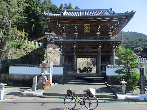 自転車遍路でお邪魔しました。 41番札所龍光寺からは4km弱の道のりで、下り基調です。 小高い場所にあった龍光寺と違い、田園風景の中に佇んでいました。 仁王門の脇には遍路小屋があり、自転車は遍路小屋脇に置かせてもらいました。 土佐の修行の道場を歩いてこられた歩き遍路の方は、ようやくホッとする区間なんでしょうね。