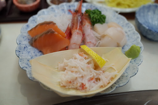 朝食・夕食とも2階のダインニングでいただきますが、かなり広め(だだっ広い)の部屋です。 夕食は、お刺身に小さな鍋(タコしゃぶ)にその他もろもろ、まさにThe旅館の晩ごはん!!が準備されております。 朝食は、バイキング形式となっておりますが、おばちゃんがごはんをよそってくれると言うありがたいシステムとなっており、ほんのチョッピリおかわりしたいなあ~とか、テンコ盛りで一杯だけにしようと言った行為は、かなり勇気の要る事と思われますの...