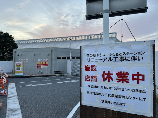 なお、道の駅に入っていたテナントは川の対岸の「道の駅やちよ 農業交流センター」のほうに臨時移設して営業しており、実質的に対岸の農業交流センターが暫定の道の駅本施設として運用されている。2025年10月に職員に深夜時間帯に常時使用可能か訪問して聞いてみたところ、普通車駐車場(P50台)は24時間使用可能だが19:00以降の深夜はトイレが使用不可となっており、残念だが道の駅の所定要件(24時間駐車場+24時間トイレ)を満たせていない。せめて駐車場内の屋外に自販機と仮設トイレでも置いておけばよいのに。