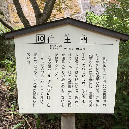 仁王門(山寺立石寺) 概要: 仁王門は参道の中腹にある入母屋、銅板葺、三間一戸、八脚単層門、総欅、素地造りで周囲の景観と一体化し山寺立石寺の象徴的な景観の1つです。 木鼻には獅子、蟇股には波を模した彫刻が施され、天井は格天井、屋根は2重垂木、華美な装飾は少なく力強い意匠となっています。「嘉永元年(1848)に再建されたけやき材の優美な門で、左右に安置された仁王尊像は、運慶の弟子たちの作といわれ、邪心をもつ人は登ってはいけないと、睨みつけている。後方の閻魔王がこの門を通る人たちの過去のおこないを記録するという。 右の岩穴に見える石塔には、亡くなった人のお骨が入っており、他の岩穴にも古い人骨が納められている。」とあります。 発願者は立石寺第65世情田和尚、仁王像(阿像・吽像)は鎌倉時代初期の名仏師運慶の13代後裔の平井源七郎が手懸...