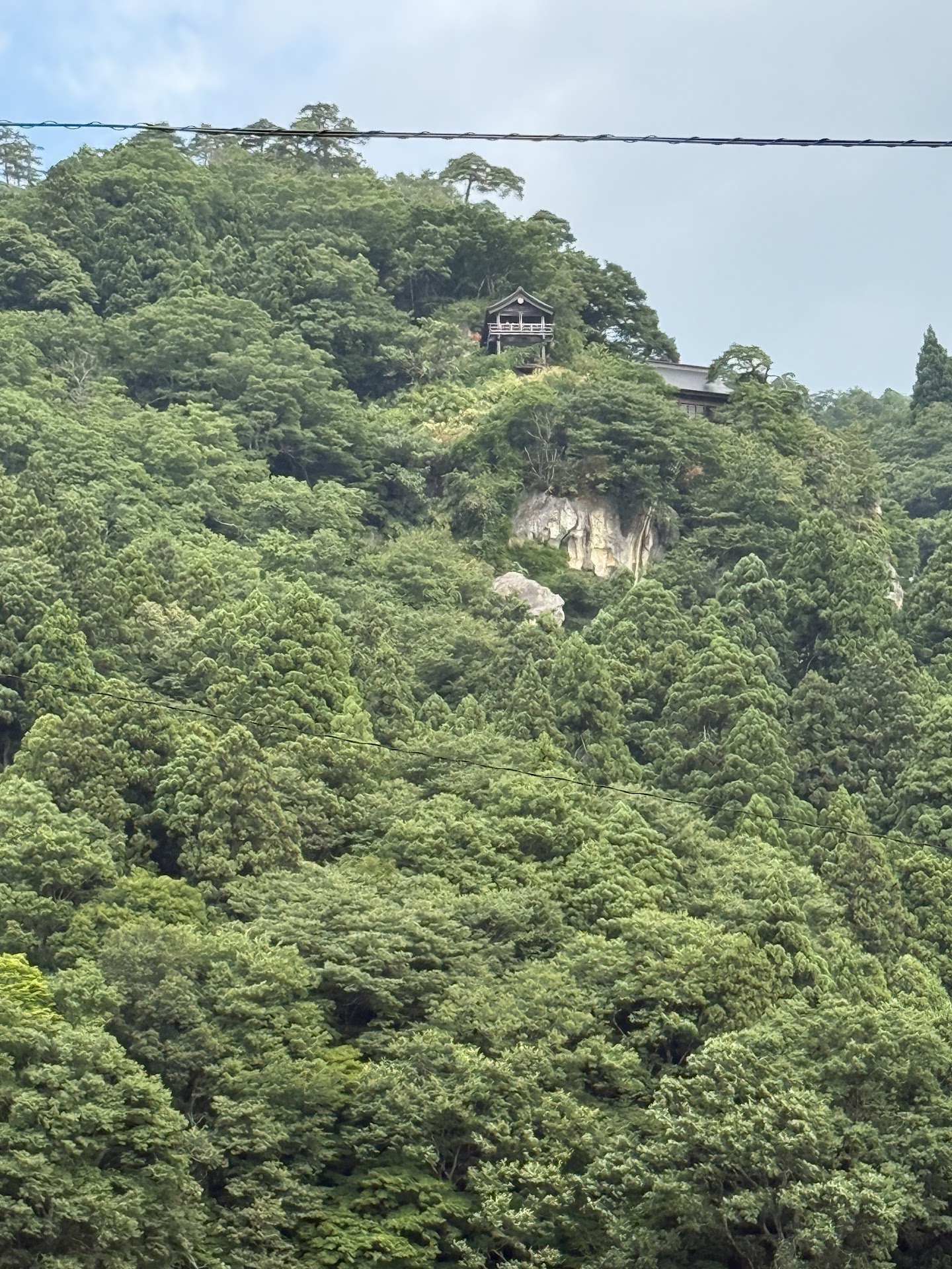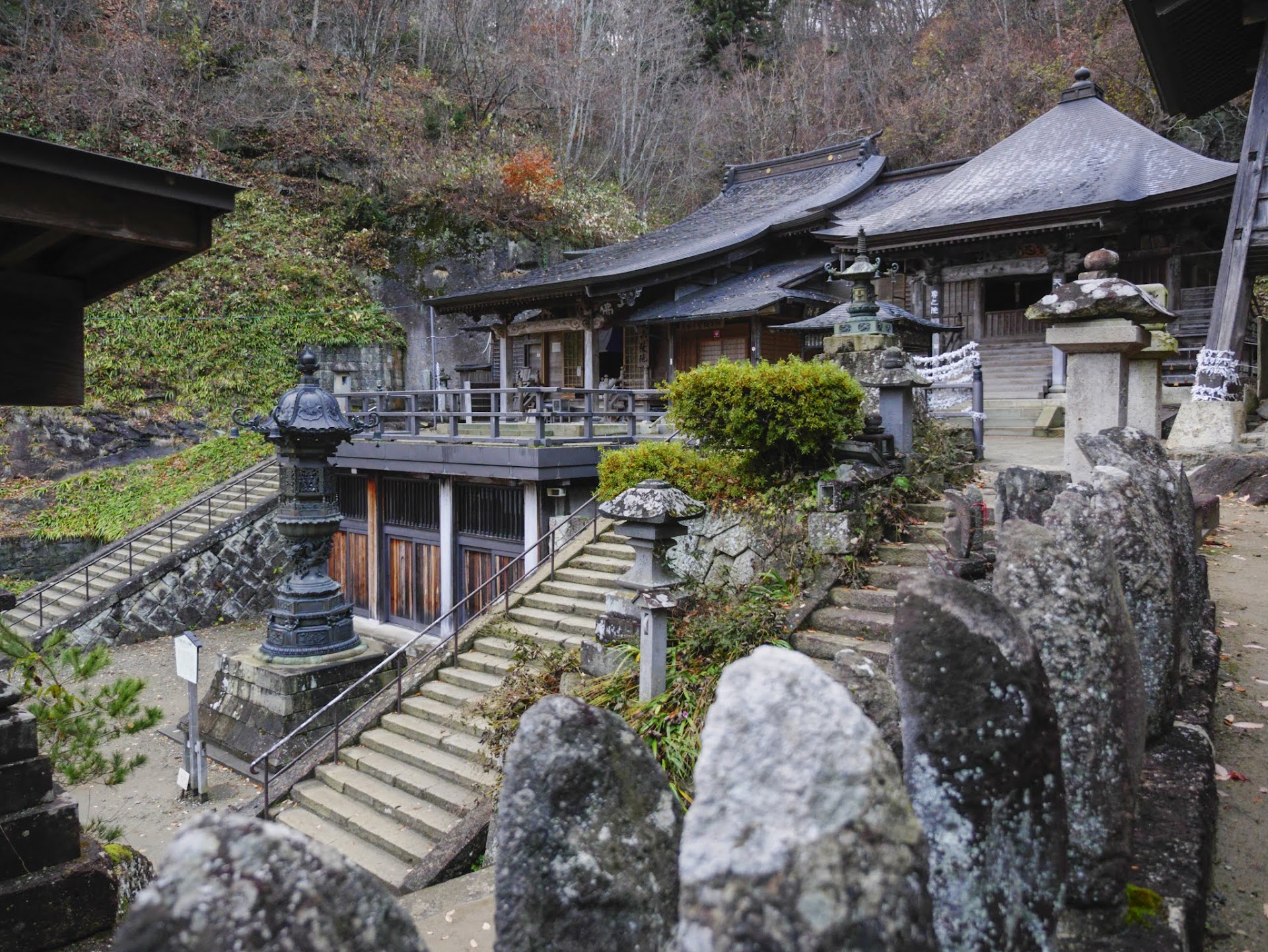 The present Konpon-chūdō (Main Hall) is a Muromachi period (1333–1568) construction of beech, which is rare as a building material. The temples clinging to the steep rocky hillsides are picturesque and unusual. The thousand step climb through the dense cedar trees is worth making to the temples at the top and for the view from them. The principal image of the main temple is the Heian-period seated wooden image of Yakushi Nyorai (the Buddha Bhaisajyaguru), an important cultural asset. Yamadera holds many other important cultural assets in its treasure house, the Hihokan, including standing wooden images of Shaka Nyorai, Yakushi Nyorai and Amida Nyorai, a seated wooden image of Dengyo Daishi, a hanging wooden mandala of Buddha, and a stone monument of the Nyohō-kyō Sutra from 1144.