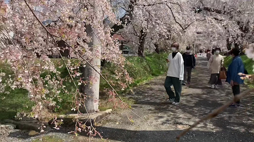 ピンク色で満開の枝垂れ桜が風に揺れる様子は、毎年見ていますが圧巻でした。