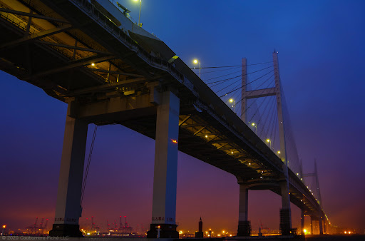 My first shots were taken about 30 minutes before sunrise. The weather seemed to worsen and a fog started rolling in. The sky was initially a dark blue, but as we got closer to sunrise, the yellowish lamp posts lining the piers on the other side of the bay created a warm, soft violet color that was ever more visible as the clouds descended and the blue hour got brighter.