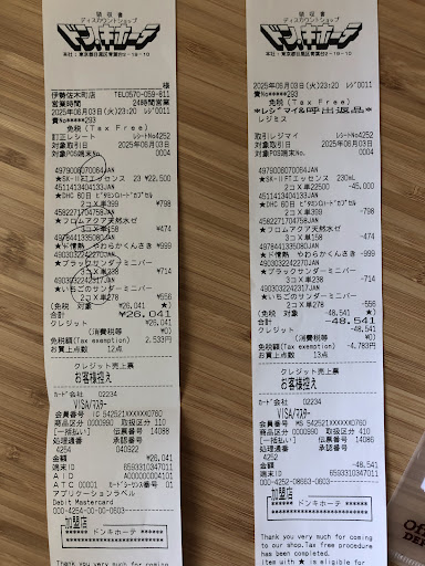 I doubt that it’s been mistakes or intentional mistakes. It’s rainy at 9pm, I went there for last minute shopping and bought a lot of stuffs for tax free. At Tax free checkout counter, two staffs helped each other to scan and put everything in a clear sealed bag. The receipt has a long list of what I bought in Japanese that I couldn’t understand at the spot.