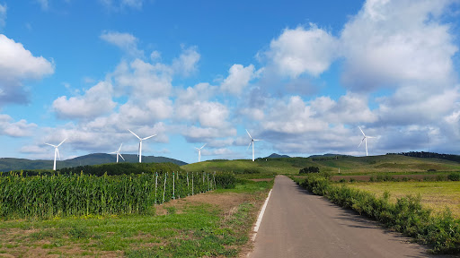 2019.5/18 菜の花が視界一面に広がるこの季節、最高です。さらに風力発電翼が優雅にゆっくりと回っています。