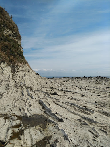 石灰岩ベースの白い岩肌と、重なる黒い岩肌(関東ローム層?)や、よくよく見ると化石っぽい何かが埋まっている地層も。 壮大な三浦半島の年数を物語ってるみたいでした。