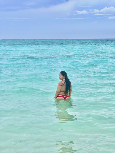 人もほとんどおらずプライベートビーチ感を味わえました。晴れていれば白い砂浜に照り返す日差しでサングラスが必要です。 また岩場があり木陰になるので防水レジャーシートを持ってピクニックも良いですね。