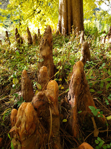 Read more2021年11月上旬、初めて立ち寄りました。時期的なのかもしれませんが公園内はかなり荒れていました。それでもキラキラ光を放っていた睡蓮の葉色が鮮やかで目を惹きました。春先にはこの睡蓮の葉が高く伸び自己主張を始め、やがて可愛い花を咲かせるのかなと思いながら眺めました。狂い咲きなのかピンクの皐月が咲いていました。その向こうに紅葉した木が在り春と秋の同居が面白かったです。駐車場から見て奥の左側に松ボックリに似た実を着けた木が数本ありその根元付近に不思議な芽(?)が出ていました。【疑、松ボックリから芽が出た感じでした】 真っ...