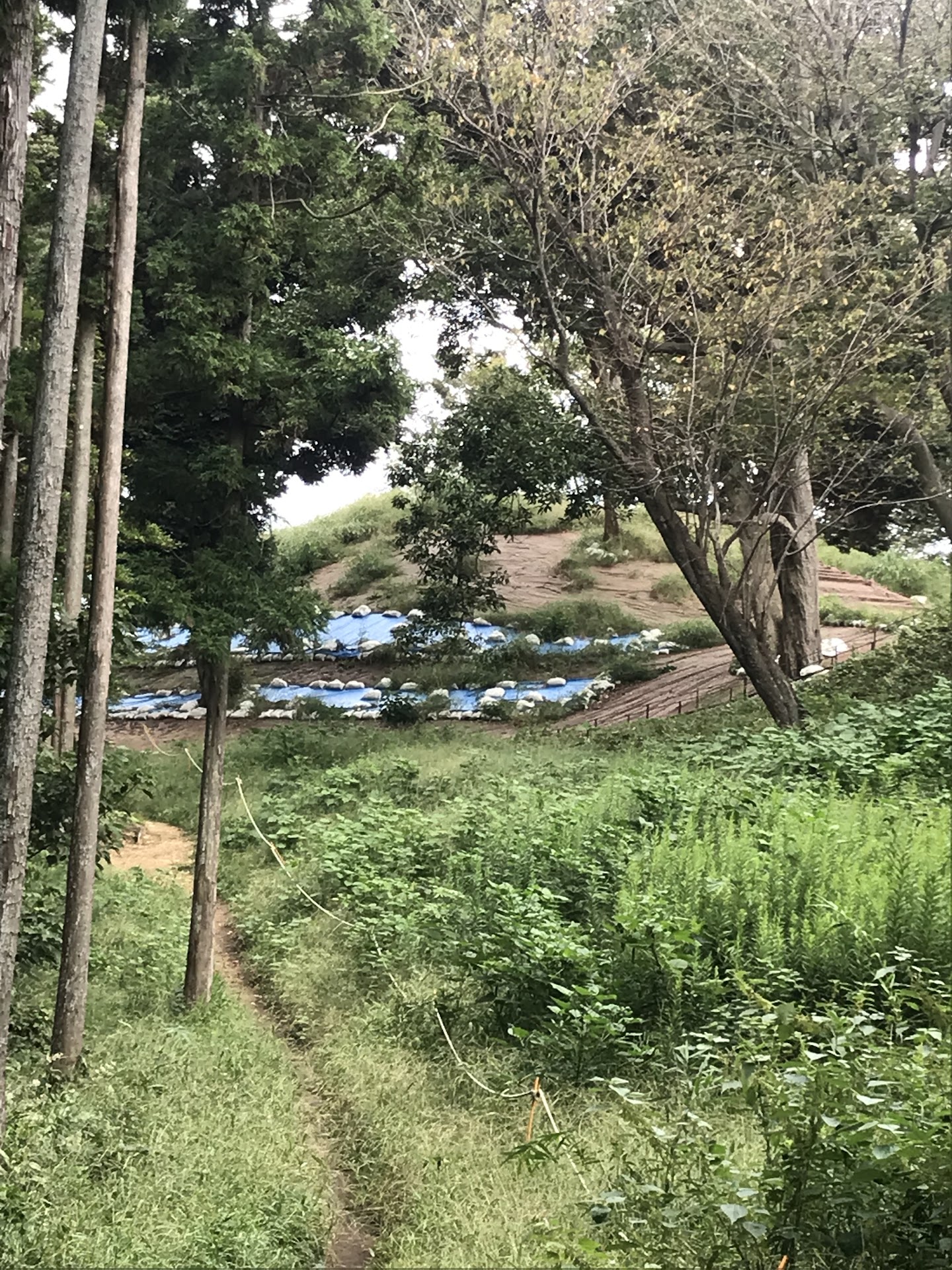 古墳を間近に見るための古墳の整備工事が中断されてしまっているようで、古墳のまわりにロープ柵が回されていました。古墳の側面には防草シートが貼られていましたが、古墳に登るための擬木階段は既にできているようでした。 しかし、ここに来るまでの道の険しさを思うと、そんなに集客の見込める場所でもないし、市の財政が厳しいのなら整備の再開は難しそうだなぁ〜と、思ってしまいました。
