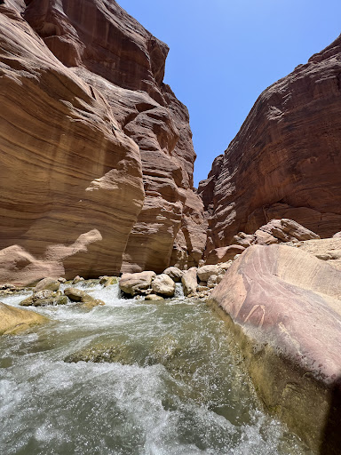 The hike through Wadi al-Hassa is a mesmerizing journey through diverse and dramatic landscapes. One of the most striking features of this trail is its clear, refreshing streams. The water meanders through the canyon, providing a cooling respite for hikers as they navigate through the rocky terrain. The crystal-clear waters are perfect for a quick dip, making the hike both invigorating and refreshing.