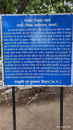 Read moreMandwa Mahal. Mandwa Mahal near the Bhoramdeo temple is another beautiful historic monument. Just one km. away from Bhoramdeo, Mandwa Mahal is known as the memorial of the marriage of Nagwanshi king and Haihawanshi Queen. Mandwa is a word from the local dialect synonymous to marriage pandal. Mandwa Mahal was originally a Shiv temple but due its shape, like a marriage shamiyana, it is known as Mandwa Mahal. It is also called Dullhadeo. Nagwanshi emperor Ramchandra Deo has built it in 1349 A.D. The Shiva Linga is inside the Garbha Grih and the Mandap rests upon 16 pillars.