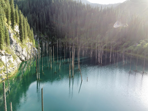 The lake contains trunks of submerged Picea schrenkiana trees that rise above the surface of the lake. The area is often referred to as a "sunken forest". The cold water helps preserve the tree trunks, which are overgrown with algae and various other water plants.[3] In recent years, Lake Kaindy has become a popular international tourist destination.[citation needed] The lake is also known for ice diving and trout fishing in the winter season.