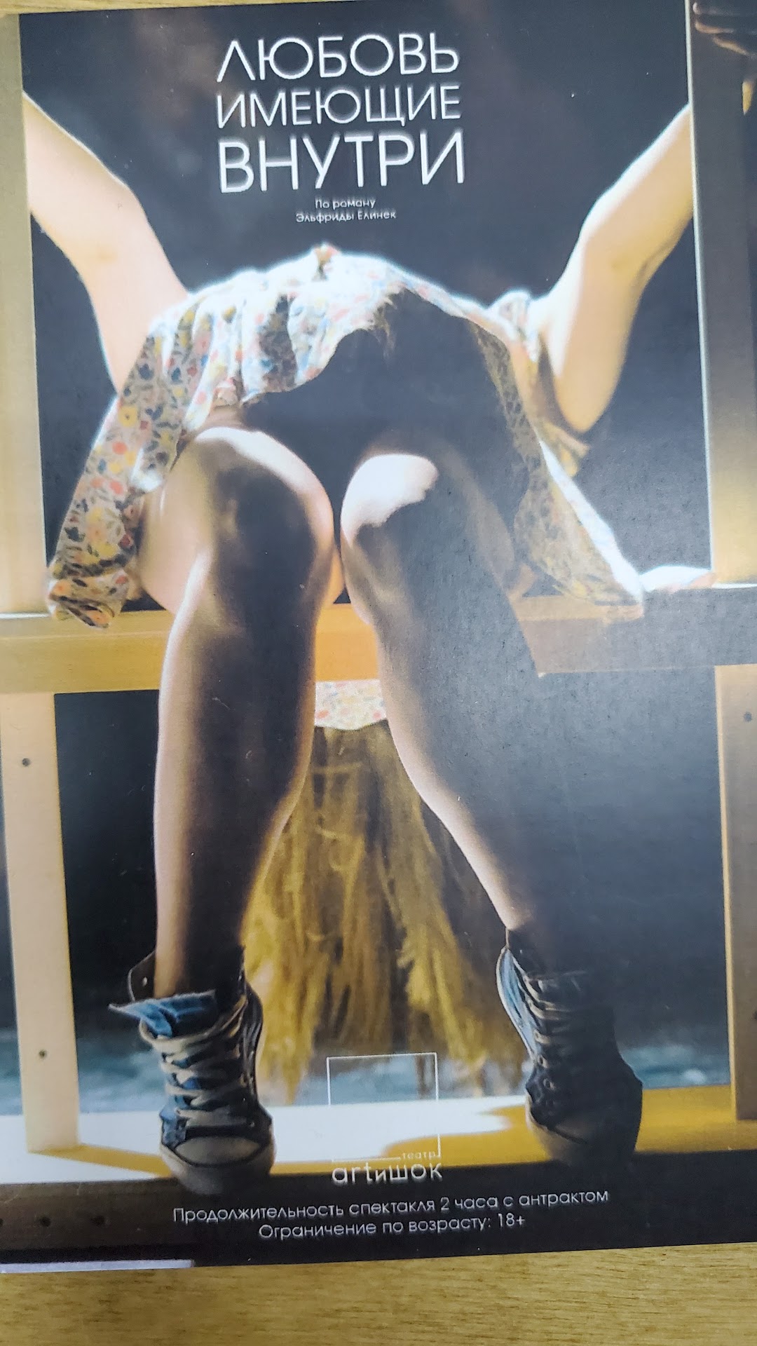 Посетил театр современного искусства "Артишок" (Большая Сцена, Алматы). Спектакль (аж в 2х отделениях) «Любовь имеющие ВНУТРИ" по роману Эльфриды Элинек. Сразу скажу, по мне, так лучше посетить балет или оперу. Почему? Постановка шокировала! Впервые услышал со сцены из симпатичных уст молодй артистки заявление, что « у неё есть п.зда»! да да да вы не ослышались! именно ... что есть пи.да. В этом... как-то не приходиться сомневаться😂, хотя даже автор книги использует термин «мохнатка». Мое мнение -актеры переигрывали или не доигрывали. Что-то не то((. Состав труппы - молодой, окромя изображающей пьяную мамку, но она тоже чрезмерно громко орала. Публика в театре, как бы точнее выразиться,... МММ... наверное глубоко толерантная. поэтому , не реагировала на выкрики актрисы о том, что «у неё есть пиз.а. « Сходите, может кого заинтересует. 17.18.19.01.2020 будут представлять постановку под звучным названием "Мен...
