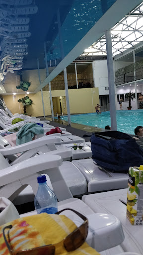 Место не плохое, но есть два минуса - кухня расположена на первом этаже в одном конце, а барная стойка, где официанты пробивают еду находится на ВТОРОМ этаже в противоположном конце. И там же рядом столики с желающими покушать. И официанты, молодые, не опытные пацаны, практически дети, бегают с нижнего этажа на второй этаж через весь бассейн по мокрому полу, с выпученными глазами, забывая то одно, то другое изза этой суеты. В общем как-то не продуманно это и очень жаль молодых ребят, которые явно не справляются с обслуживанием такого количества людей в таких условиях. На счёт самой еды, честно говоря тоже не остались довольны. Детям заказали пицца маргариту,т.к. они только её едят, но как ни странно помидор в ней просто не было. Ни одной помидоринки. Изза этого сыр стал жёстким как только пицца подостыла. Себе взяла ганфан. Очень расстроилась, т.к.мясо было полно жил, ни одного чистого нормального куска не было. И третий минус, самый главный - на первом этаже плиткой выложенный пол и возле детского бассейна естесственно разливается вода, а маленькие дети, как правило, не ходят, а бегают. Мальчишка поскользнулся, упал и тут же расшиб себе голову так, что трещина была обнаружена сразу же явно. Моя 4-х летняя бегала, через минуту забывая, что только что обещала мне не бегать. В общем будьте осторожны с детьми на таком полу. От хлорки в воздухе пощипывает глаза. В остальном бассейны не плохие, сауна тоже, не плохое заведение если исправить...
