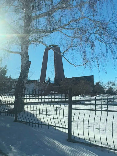 The three-level layout, with its striking sculptures and serene gardens, creates a somber yet reflective atmosphere, set against the stunning backdrop of the Tien Shan mountains.