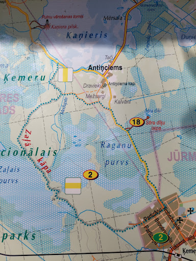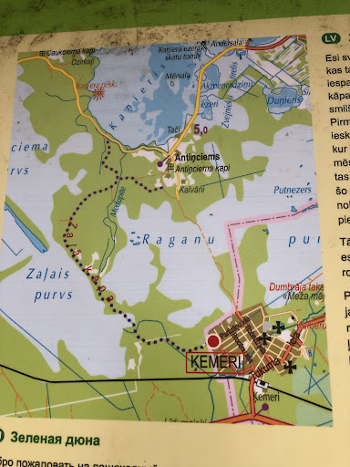 Read more🌏Зеленая дюна - один из интереснейших природных обьектов парка. Место, где 4500 лет назад плескалось Литориновое море теперь поросло лесом и на этом месте образовалась высокая Зеленая дюна. Маршрут пролегает по лесу, среди мхов, болот, ельника и соснового бора. Начало маршрута - в конце улицы Partizānu iela, откуда через сосновый бор, вдоль Зеленой дюны можно выйти к сероводородным прудам и Ведьминскому болоту(Raganu purvs), а потом обратно в Кемери. Такой маршрут вам обойдётся в 14 незабываемых километра. Будет тяжело, но оно того стоит. Самый крутой конец дюны будет оборудован лестницей и стойкой для велосипедов.