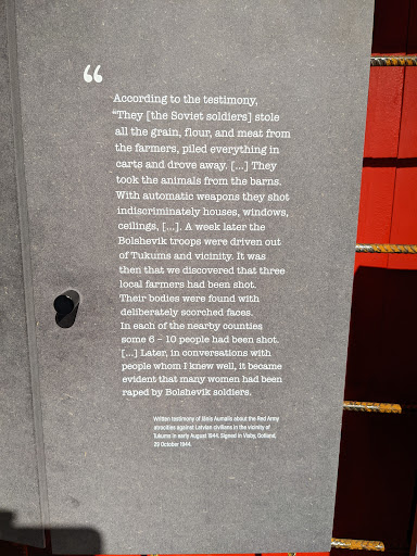 The museum is located in a new or renovated building with four floors. The entrance is on the first floor/ground floor and the exhibition is on the second floor/first floor (mainly) and the third floor/second floor (a less part showing the last years). The toilet is in the basement. The exhibition is a traditional exhibition where you as a guest walks around and watch and read about the soviet occupation (briefly also about the nazi occupation). Since the underlying idea is that Latvia is a sovereign and independent state and has its right to be just that, it is beyond all doubts in the exhibition that the occupation is something genuinely evil. Depending on the level of interest and how much the visitor has energy enough to take part of (i.e. read) the visit will take between 30 and 90 minutes. If anyone visit the museum with the only reason to make a mark in the box (”been there, done that”) it is possible to rush through the two floors...