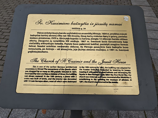 Read moreThe Church of St. Casimir (Vilniaus Šv. Kazimiero bažnyčia) is a landmark of immense historical and architectural significance in Vilnius Old Town. 🌟 Key Facts First Baroque Church: It is the first and oldest Baroque church in Vilnius and the entire Grand Duchy of Lithuania. Patron Saint: The church is dedicated to Saint Casimir (Šv. Kazimieras), the Holy Prince and patron of Lithuania, who was canonized in 1602. Architecture: Construction began in 1604 by the Jesuit Order, modeled after the famous Church of the Gesù in Rome. Unique Dome: Its most distinctive feature is the majestic, stepped cupola crowned with a royal crown, which was added during an 18th-century reconstruction led by architect Thomas Zebrowski. This crown symbolizes Saint Casimir's rejection of a worldly crown for a heavenly one. Turbulent History: The church endured multiple fires and reconstructions, and was used as an Orthodox church under Tsarist rule. During the Soviet era, it was closed and infamously converted into a Museum of Atheism (1963–1988), with all its sacred interior destroyed. Present Day: It was returned to the Catholic community in 1988 and is once again run by the Jesuits. It is known for its beautiful interior, artificial marble altars, and frequently hosts organ concerts due to its...
