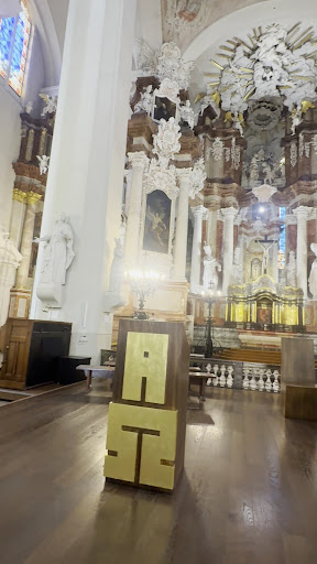 Our tour group does not come here to enquire about the courses offered by the university, but to admire the architecture, the church, and the decorative vaulted ceiling.