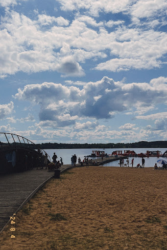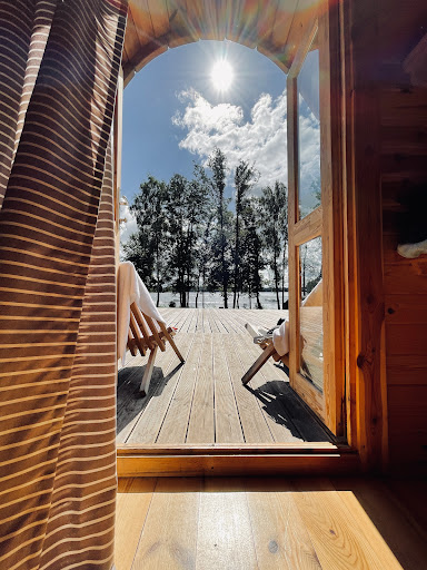 You can drive onto the small island with your car if you stay there. There's a sign that says it's allowed with a permit and you will get the permit once you are checked in. We came on a Tuesday evening in the end of July and there were plenty of free cabins. The cabin is small but still fine for a short stay. The window has a bug net so it's possible to leave it open for the night to get cool air inside. The toilet was very nice, no bad smell. Lots of activities for the kids outside. The view is stunning from the right hand side cabins overlooking the lake and the Zarasai town across the lake. It's also possible to stay with a tent. The prices in summer 2025 were: tent 6€, adult 4€, child 2€, pets free. The only annoying thing for us was that the trampoline on the water was supposed to open at 11 but opened an hour later and we had to leave by then so the kids were sad. All in all it was wonderful for us to stay here for 1...