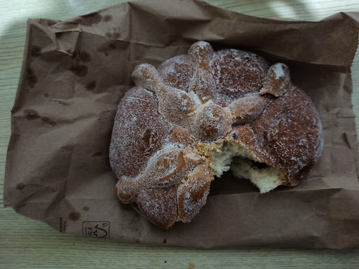 Pan de muerto con un toque de chocolate.... Delicioso. Como comentario creo que tiene mucha azúcar espolvoreada