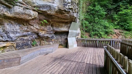 The star of our visit was Schiessentümpel, a pretty waterfall with water tumbling over big rocks. The sound of the water made the whole place feel calm. Nearby, the stairway Mëllerdall climbs up the cliff side. Climbing these stairs is easy enough, and the view from the top is wonderful. You can see more rocks, trees, and the small stream below.