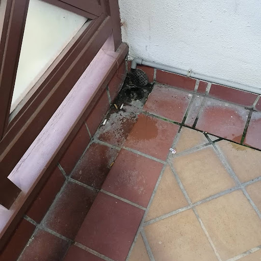 The toilet floor of one toilet is uneven such that water is flooded at the entry area.