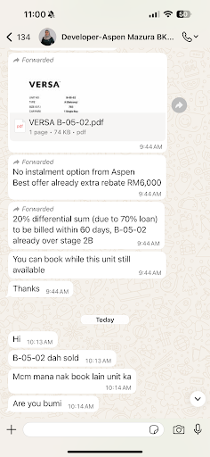 Bumiputera Reserved Units Frankly, the units reserved under the Bumiputera quota appear to be of poor selection, with locations and layouts that do not appeal to serious buyers. Other developers I have dealt with allow flexibility to choose better units and subsequently convert them to Bumiputera lots. Unfortunately, Aspen’s current approach feels discriminatory and discouraging. Showhouse vs. Actual Build-Up The showhouse design and build-up do not reflect the actual units being sold. This misrepresentation raises serious concerns and creates unnecessary mistrust in the buying process. Customer Experience I did not feel welcomed or valued as a customer throughout my interaction with Aspen. This lack of hospitality strongly influenced my decision to withdraw interest from Aspen projects altogether.