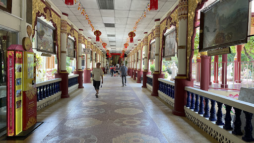 It is said to be the largest Buddhist temple in Southeast Asia, divided into two by a street. You can take bus number 201 to get there, which is not very far from the old town of Penang, making it very convenient as the bus stops right there. The most striking feature in the left temple is the paintings above the corridor on both sides, depicting the life of Buddha. These paintings are not by a single artist; their styles and quality vary, all funded by Buddhists. Some of the paintings are exceptional, while others clearly exhibit the style of Relikh. The temple is adorned with various statues, complemented by green vegetation, creating a beautiful scene. In the main temple, monks are performing rituals for the faithful. The Buddha statue worshipped in this main temple is a modern creation, not only differing in facial and bodily appearance from the traditional Buddha images but also adorned with an electronic light halo on its head.