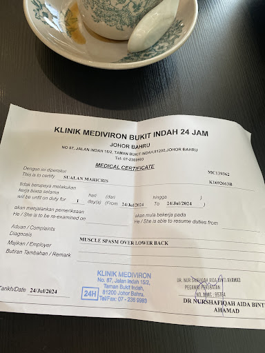 Read moreI always come to Mediveron, their service was good back then. But today (27/8/2025 around 1.40pm), I came here after a bad fall and was treated by a young Malay doctor. He was very professional and kind, and advised me to do an X-ray as my foot was swollen. However, my experience after that was very disappointing. I waited in front of the X-ray room for a long time without any updates. One of the nurses was busy chatting and joking with her husband, who came just for an MC, did not register, just walked in and sat at the bench beside me infront of the xray room. The same Indian nurse in her green uniform did not show the courtesy to inform me about the waiting time and left. Feeling neglected, I eventually walked to the counter and left after settling the consultation fee. While I truly appreciate the doctor’s care, I must say I was disappointed with the attitude of some of the Indian staff as well. As an Indian myself, I had expected at least a little more understanding and support, but unfortunately, their service was far...