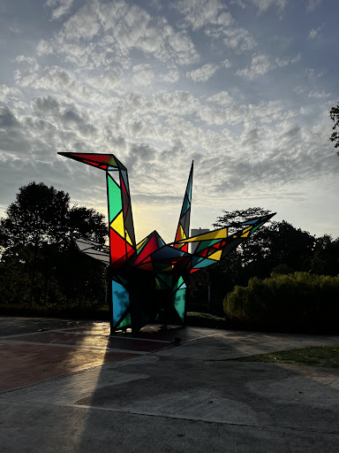 There is a nice lake, and jogging track. There is exercise equipment and a small playground. The signature origami bird stands tall and is such a great sight when the sun sets. Across origami is the club house I see people jogging and walking...