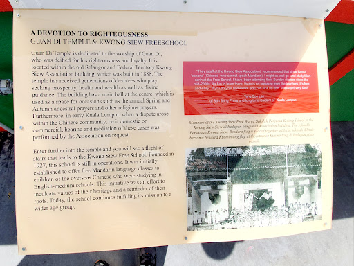 Read moreGuan Di Temple 關帝廟 A DEVOTION TO RIGHTEOUSNESS GUAN DI TEMPLE & KWONG SIEW FREESCHOOL Guan Di Temple is dedicated to the worship of Guan Di, who was deigned for his righteousness and loyalty. It is located within the old Selangor and Federal Territory Kwong Siew Association building, which was built in 1888. The temple has received generations of devotees who pray seeking prosperity, health and wealth as well as divine guidance. The building has a main hall at the centre, which is used as a space for occasions such as the annual Spring and Autumn ancestral prayers and other religious prayers. Furthermore, in early Kuala Lumpur, when a dispute arise within the Chinese community, be it domestic or commercial, hearing and mediation of these cases was performed by the Association on request.
