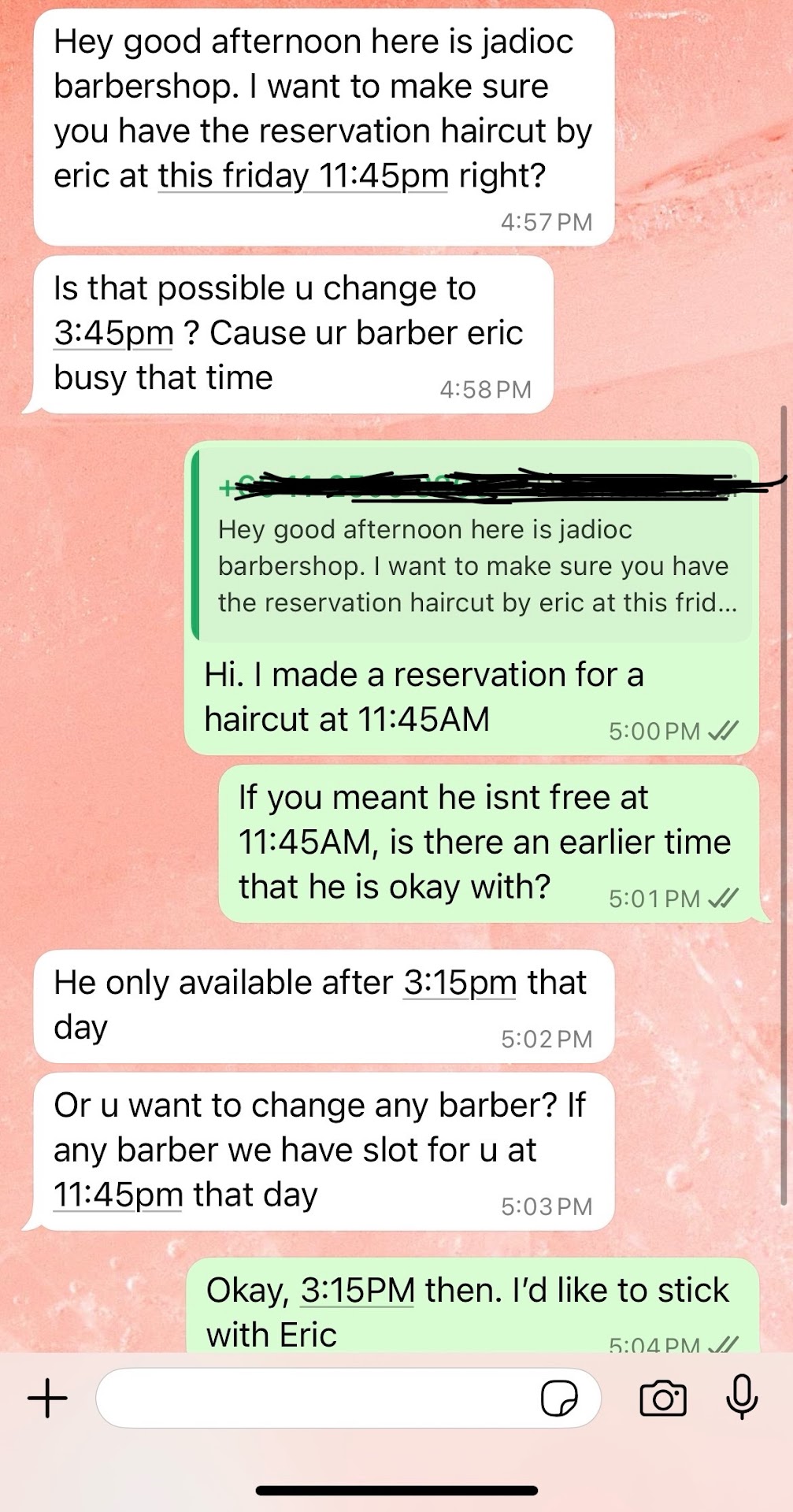 I was extremely annoyed and said I’m okay to get my haircut from another barber. To my surprise, the barber said “there are no open slots now, you’ll have to wait until 4:30PM”. I couldn’t wait any longer as I have other commitments.