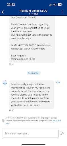 ๐ฆ๐ต๐ฎ๐ฟ๐ถ๐ป๐ด ๐๐ต๐ฒ ๐บ๐ผ๐ฑ๐๐ ๐ผ๐ฝ๐ฒ๐ฟ๐ฎ๐ป๐ฑ๐ถ ๐ผ๐ณ ๐๐ต๐ถ๐ ๐ฝ๐ฟ๐ผ๐ฝ๐ฒ๐ฟ๐๐ ๐ถ๐ป ๐๐๐ฎ๐น๐ฎ ๐๐๐บ๐ฝ๐๐ฟ, ๐ ๐ฎ๐น๐ฎ๐๐๐ถ๐ฎ, ๐ฎ๐ป๐ฑ ๐ต๐ผ๐ ๐๐ต๐ฒ๐ ๐ฒ๐ ๐ฒ๐ฐ๐๐๐ฒ ๐๐ต๐ฒ๐ถ๐ฟ ๐๐ฐ๐ฎ๐บ.||I booked a service apartment in KL named Luxury Platinum Suites KLCC By Lux Stay. This is the exact link name on booking.c0m||I'll explain why they are probably still highly rated, and they have numerous accommodations in KL. By the way, I paid over 6,000 pesos for this room for two nights because it was initially a 1-bedroom apartment.||On June 14, I received a WhatsApp message regarding my reservation, informing me that I needed to transfer to a condo at Axon Residence from Luxury Platinum Suites KLCC. I asked them why I needed to transfer rooms, and they said the room was under maintenance โ which was a lie. ||How did I know? The same room was still available on Booking.com on that date. They downgraded my reservation from a 1-bedroom unit to a studio, and I paid the same price. Because I didn't want to argue anymore, as I'd already been traveling for two weeks, I just said yes and told them that they weren't giving me better options.||I booked a Grab from KLIA2 going to Axon, then I got another message to transfer to Lucentia Residences. It was very annoying because it meant changing locations again. I just said okay again because I was too tired to argue. I never received a single apology or empathy. So, I arrived at Lucentia and was given a very small studio room with dirty walls and dirty linens. I tried to report it to Booking.C0m customer service and didn't get any immediate help because they couldn't contact the property. So, I ended up staying in this room, which was so overpriced for what I paid. I just let it pass because I didn't want to ruin the last two nights of my travel.|I arrived back in Manila and received a notice from Booking.c0m that the owner of the property was canceling my reservation because I didn't stay with them, which I objected to, but there's been no response from Booking.com yet. The reservation got canceled, which means I can't leave a bad review for this property. This is how they can keep their rating high. I just saw one review that they probably failed to cancel, which left a review saying they are scammers.|,|So, if you are booking a hotel outside the country, it's better to stick to a traditional hotel. Lesson learned for me not to try booking a service apartment again. Please share so more people will be aware.||Check screenshots of our conversations.||Booking.com, I hope you have immediate action on...