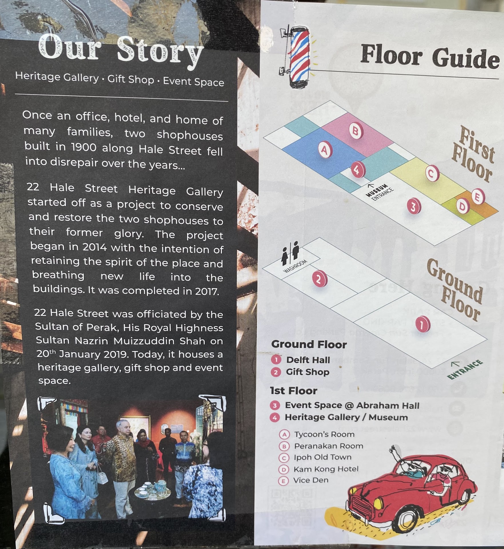 Read moreThis Heritage Gallery entrance is at number 22 and extends to number 24 which was the last hotel of the Hale Street. The ground floor is bright with natural light flowing from different points, bringing eyes to move to every corner to catch Old Ipoh history. The green stairs are not opened to guests but used to display some items of this history. Alternative modern stairs bring to the 1st floor where the artificial light is used for the Event Space which is an exposition of a local artist. The connecting path leads to the 5 parts of the Heritage Gallery, each part has interesting information with a number referring to the audio guide. The audio guide is available inside their website, displaying in audio or in written some additional information related to life in Ipoh. The photo and notes about dulang ladies during this tin mining period can be fully understood once’s this visit is followed by a visit in the small museum IPoh World-Han Chin Pet Soo which requires a booking online even if no entrance fee. These areas of Heritage gallery display also sounds and videos giving you an immersive experience. The fee is RM 15 for audio-guide, RM 30 for guided visit at specific times. The lady at cashier is discrete and let you take the time you need to look at the renovation story and some items and books related to Ipoh at the Delft Hall which is...