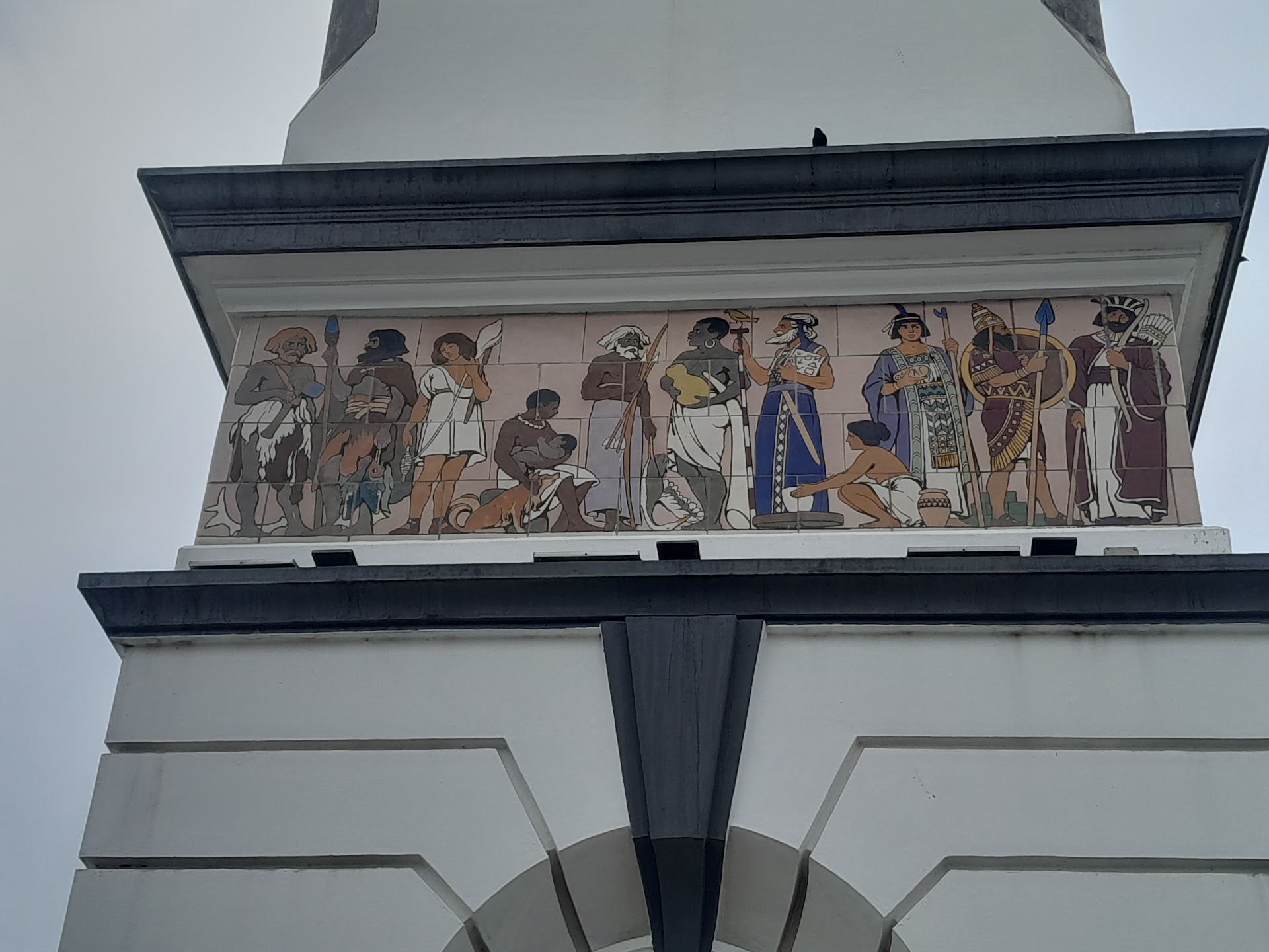 The four mural panels depict the advance of man from prehistoric times to the beginning of the twentieth century. In these four panels, you may notice that all the women depicted are seated. Some of those people portrayed are instantly recognisable. The seated statues at each corner depicts the four virtues of life.