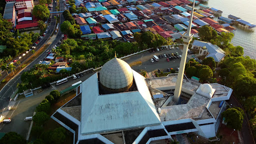A view from the sea to the Sandakan neighborhood mosque in Sandakan city on the east coast of Malaysia.