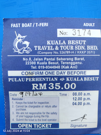 Read moreHotel arranged this agent for me. She called me like 2 hours before and asked me what time I’ll arrive besut Jetty. When I arrived there was a guy who will send you to your car park slot 10 rm a day and fetch you on your bike back to the jetty. While she brings you directly to your boat. I reach at 130 I was on the boat at 1:50pm. I think it’s 35rm one way one person( I took a package so the hotel...
