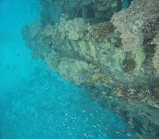 Large corals have grown on the shipwreck. The entire site is full of colorful fishes. Swimming there feels like you are in a aquarium. One of a kind experience.