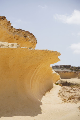Just off the clifftop road is an unusual landscape of overhanging rocks that look like a wave of sand frozen in time. You also get great views of the cliffs to the west from here.