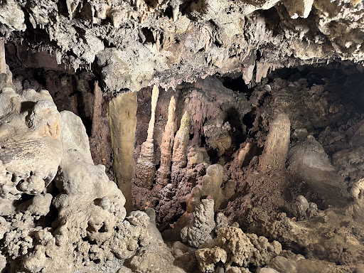 The whole thing has been left pretty much as it was found (apart from installing some electric lighting), so you just stand at one end of the cave and look through at all the stalagmites and stalactites. The cave apparently extends a long way back but isn't all visible.