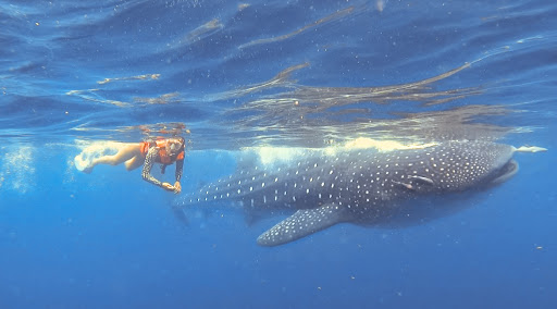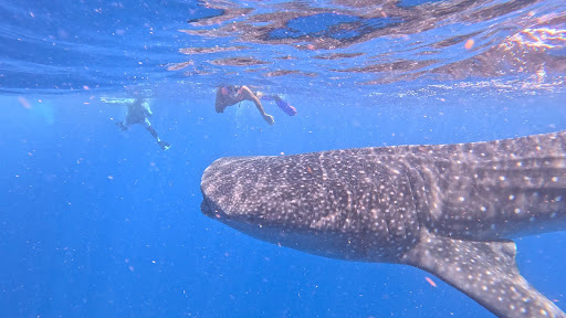 As we see one of the humongous sharks heading right for the boat, our guide IvƔn yells "jump over board.... NOW" !! Boom my wife and I hit the water and turn around and look straight into the gaping mouth of a HUGE, "beautiful" Whale Shark, less than six feet away and like a bus, was coming straight at us. Quickly we move to the side as it gently swims passed us without a care in the world, we kick hard to keep up, all the while IvƔn is taking pics and videos of us with the shark with his GoPro. The pics and video footage was a complementary part of the tour and is something we will cherish for ever....thank you IvƔn!!!