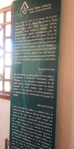 Casa Taller Literario Juan José Arreola es un lugar fundado en el año del 2008 con el apoyo del Gobierno Federal a través del Instituto Nacional de Bellas Artes (INBA) y el extinto CONACULTA, el Gobierno del Estado de Jalisco, así como del Gobierno Municipal de Zapotlán el Grande. La intención de rescatar dicho lugar, sitio que fuera la casa del fallecido escritor zapotlense Juan José Arreola Zúñiga, fue el de conservar el espacio como un lugar cultural para el uso de todo el pueblo mexicano. La Casa Taller Literario Juan José Arreola se encuentra en el municipio de Zapotlán el Grande, actualmente Ciudad Guzmán en la colonia Lomas del Barro y cuenta con espacios para conferencias, talleres de ajedrez, biblioteca, museo de sitio, sala de exposiciones, entre otros atractivos que recuerdan la vida del ilustres Juan José Arreola. Este lugar cuenta con subsidio por parte del gobierno Federal, Estatal y Municipal, por lo que se hacen eventos culturales propuestos desde los tres niveles de gobierno. Por lo que es un sitio de disfrute para los visitantes, así como de aprendizaje para quienes gustan de la literatura y la...