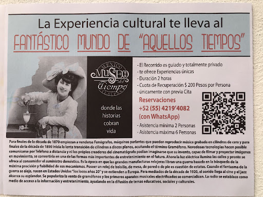 Read moreLa ciudad de México, es la segunda ciudad en el mundo con mas museos, y el museo del tiempo es uno de los mejores que tiene. Ubicado en una delegación de la ciudad en la que el clima es muy agradable, las calles muy rústicas y la arquitectura conservadora, se encuentra el museo del tiempo, un lugar lleno de historia, piezas mecánicas con valores incalculables como fonógrafos, pianolas, rockolas, entre otros y muchos tic tacs de las decenas de relojes increíbles en perfectas condiciones. El museo tiene un costo de recuperación por visita muy económico y un guía que explica las piezas exhibidas en el lugar así como el funcionamiento de muchas de ellas, ya que todo en ese lugar funciona por mas antiguo que sea. El guía me explicó la evolución de los relojes, algunos oficios muy interesantes acerca de las maneras en que se despertaba la gente antes de que existieran los relojes despertadores, los muchos tipos de relojes y sus funcionamientos, el funcionamiento de una pianola, el ¿por qué los relojes tienen el número 4 en romano como IIII y no como IV? (¿lo habían notado?), aprendí que existen los relojes de agua y su funcionamiento real, así como muchas cosas más acerca de la cultura en México.
