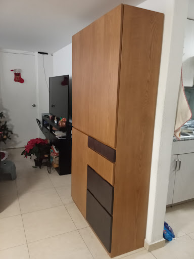 Amplio surtido de alimentos y ropa, herramientas, chácharas, con el inconveniente de la inseguridad, mas no deja de ser una buena opción para varios rubros. En uno de sus extremos están un grupo de negocios de carpintería, donde se puede hacer uno de muebles de buena calidad económicos, sobre todo si llevas tus propios diseños minimalistas. Para un comedor donde ya tenían mesa y sillas, les llevé este diseño para el mueble vertical y en una mueblería no lo encuentras y con un diseñador te cuesta 4 veces más. Ahí se muestran las sillas y mesa que tenían para ese espacio. Por ello procuramos esa chapa de encino y esos tonos, pero haciéndolo menos pesado que lo que ya había. Para otra casa, pedí 2 torres, las uní con una luna de 6 mm con canto pulido y completamos con repisas de vidrio. Compré un Quijote de bronce y un par de piedras con las que armé un rincón que me fascina. Solo le falta un cactus. Veré si le integro ese viejo dibujo de un cráneo formado por una panadera sentada con su canasta con pan, elaborado con tinta y acuarela. En cuanto a la base de cama, al poder usar la mitad como un gran arcón, ahí se pueden guardar desde el árbol de navidad y esferas, hasta chamarras y cobijas durante los meses de calor. Los buroes empotrados facilitan la limpieza de la habitación. La otra mitad de la base de la cama se utiliza para guardar el calzado. Este fin de semana envié la imagen a uno de los carpinteros de estas puertas de tambor postmodernistas para ver si me las puede elaborar. Ya...
