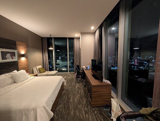 There are many things I like about this hotel and many things that need to be improved. The included parking was an unexpected bonus. The location and view were very nice. The reception staff were very inviting but i ended up checking out earlier than expected due to some problems. I ended up staying just one night which was enough to enjoy the view and get a feel for the hotel. I would probably go back but only for one night as it is a bit expensive. I really liked the television with many channels available in English and Spanish. The hotel elevators are annoyingly slow which I find strange for a new property. Be careful not to get into the service elevator or you will be stuck on it for a while. They need to make it more obvious to guests which elevator is the service elevator as it is not very clear. The restaurant was great especially 24 hours and they have very affordable meals that if you do not finish you can take up to your room. Unfortunately I did not get to experience the breakfast so no comment but it did look busy in the morning so arrive early. I liked the technology in the suite but it took me forever for me to figure out the lights. I did not really enjoy the suite or think that it's worth the extra money so next time I may just take a regular room. Despite the fact that there was a coffee maker there were no coffee cups in the bedroom... And then I was not able to enjoy the breakfast... Annoyed at the situation and due to the current Hilton promotion I decided to check out early. Luckily there was a Tim Hortons nearby which was very convienent and affordable. Overall YES I would come back but next time I will choose a different room. Hopefully service...
