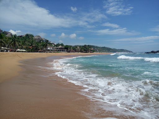 This beach is absolutely gorgeous. It's a hidden gem with many fewer tourists than other nearby beaches. My travel book doesn't even mention it. There are several beach side restaurants to choose from, and you can get here by taking a convenient colectivo ride from Puerto Escondido. They run every 15 minutes or so up to 8 PM (28 ps per person). The only downside is the limited swimming area. A beautiful rocky area with some small pools interrupts the waves and is safe for swimming and even snorkeling. Like much of Oaxaca, the long open stretches of beach are beautiful, but are unsafe for swimming because of strong rip tides and big waves. You can frolic in the shallow water short of the breaking waves, but swimming past them can...