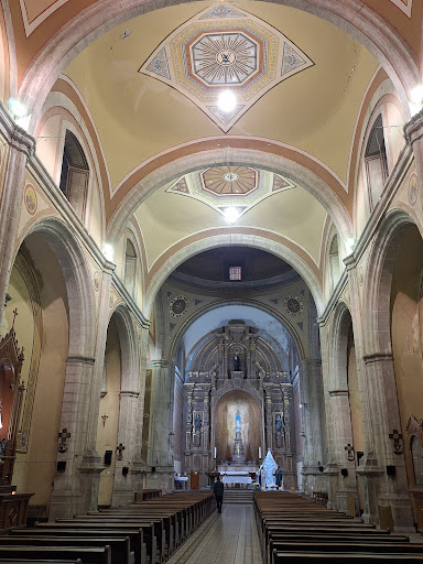 El trazo interior del templo como la mayoría de la ciudad, mantinene la forma de una cruz latina; con tres pequeñas capillas laterales. La de la Virgen de Guadalupe, localizada en el lado sur de la nave; la del Señor del Rayo, en el lado norte, y la del Sagrado Corazón, dispuesta como una prolongación del transepto sur.
