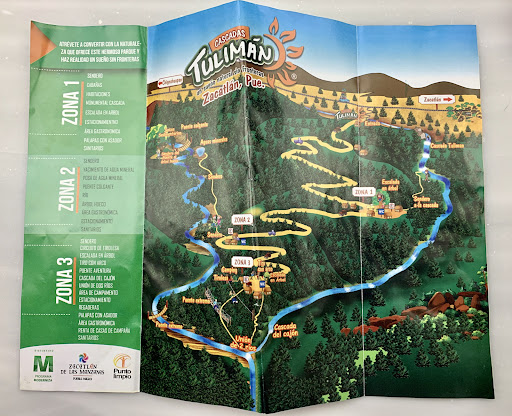 Cuenta con 3 zonas Y varios miradores. Las rutas están marcadas,para evitar accidentes. Cuentan con barandales en los miradores y en los senderos o caminos. En cada zona te prestan un bastón de madera ( opcional). Te recomiendo ir en automóvil, ya que entre una zona y otra hay una distancia considerable. Zona 1 cuenta con cabañas de alojamiento las cuales están bonitas y cómodas, pero no les recomiendo. Falta mejorar su administración, ya que llegan a rentar las cabañas dos veces y pues es incómodo y hasta molesto ya que sus soluciones no son muy favorables. ( Te pueden cambiar a otra cabaña con regadera a fuera o a otra cabaña sin agua) Las cabañas no cuentan con luz, solamente por panel solar la cual se enciende a las 6.30 PM aproximadamente y varía la hora en que se acaba dependiendo de la demanda. No hay conectores más que en la entrada de las cascadas ( tendrías que encargar ahí el teléfono) Tienen letreros donde informan que no se permite ingerir bebidas alcohólicas dentro de la cabaña. Por la noche cuentan con velador o vigilante. Te permiten hacer fogata y te llevan la leña. Zona de azadores con palapa.