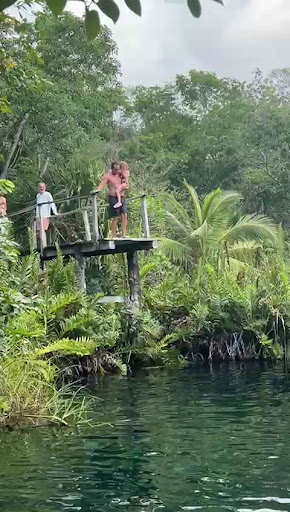 Cenote Escondido is long and has lots of seating along the ledge and at either end of the cenote . There's a rope swing and multiple spots to jump off. It's deceptively deep since the water is so clear and it looks shallower than it actually is. There were scuba divers at the bottom doing a training course or something and there was still enough depth to jump off the ledges. There was a large family and another small group of people there during our hour or two there so it wasn't too crowded. We had one end of the cenote, the large family had the middle area and the small group was at the other end. Make sure you are aware of those around you. Unfortunately we had a slight incident where my daughter and I were snorkeling in the very end of the cenote where nobody was jumping but apparently one of the dad's from the other group decided to run and jump off by us and landed right on my head while I was snorkeling. Luckily he didn't land on my daughter because I was in a lot of pain for the next couple of weeks unable to move my neck much. That cut our visit to this cenote short.